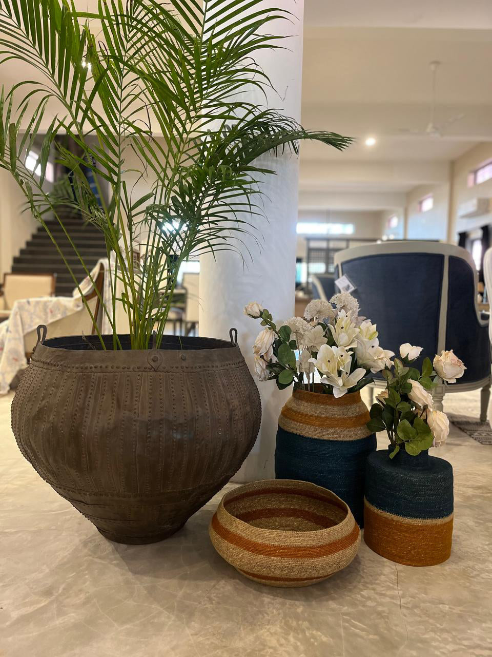 This unique, cylindrical-shaped seagrass basket in a warm teal blue tone features a narrow neck and a small mouth, perfect for adding an elegant and contemporary touch to your space. Its intricate handwoven design makes it both practical and eye-catching.
