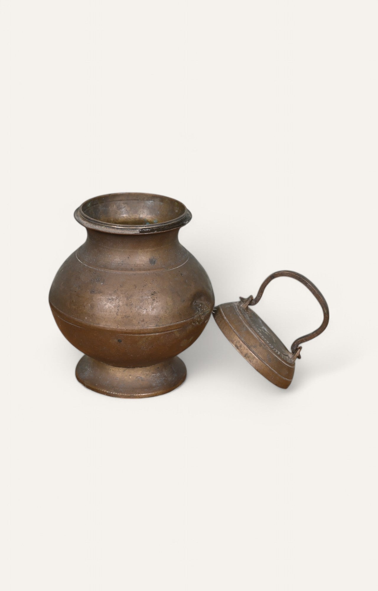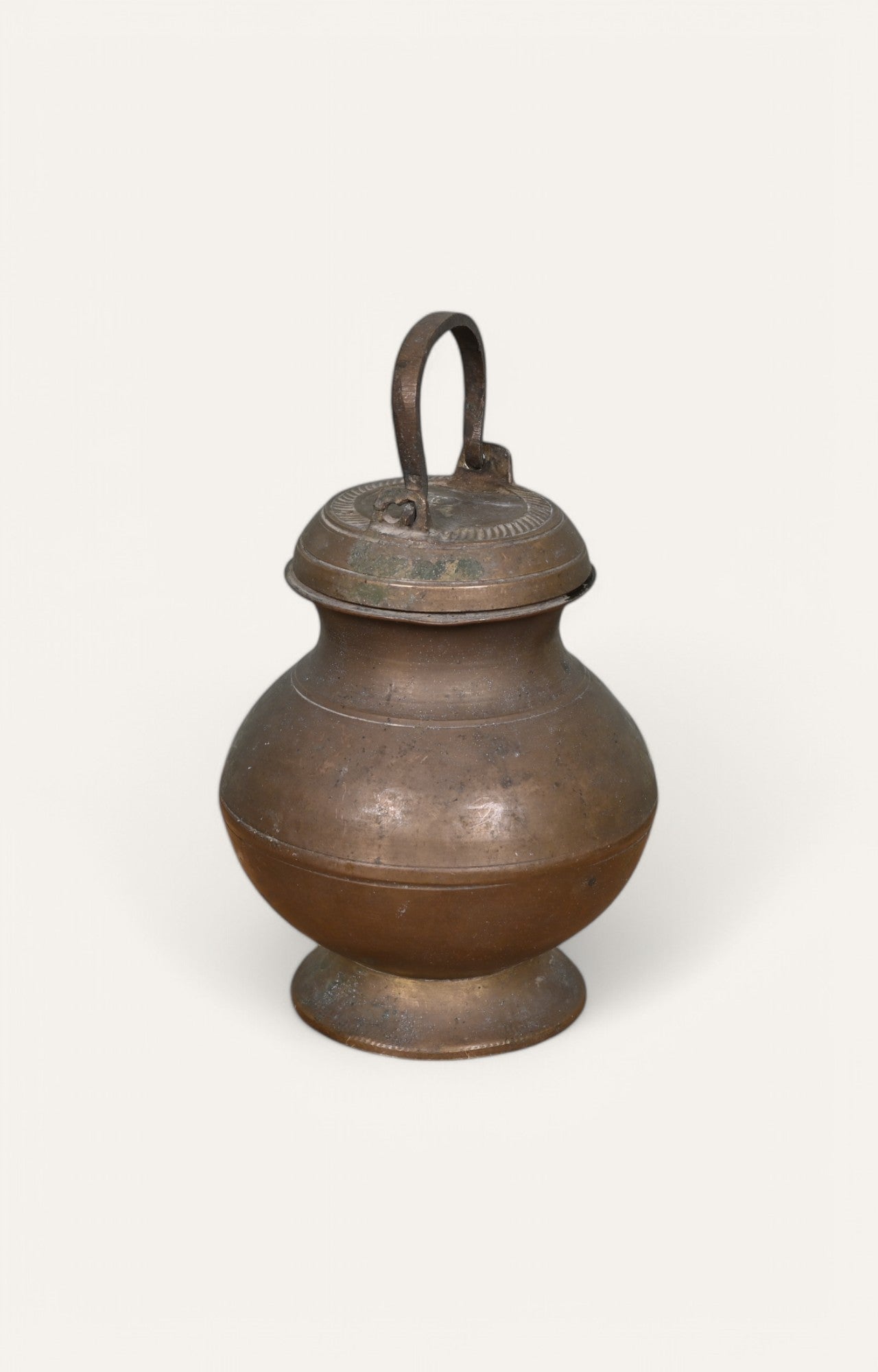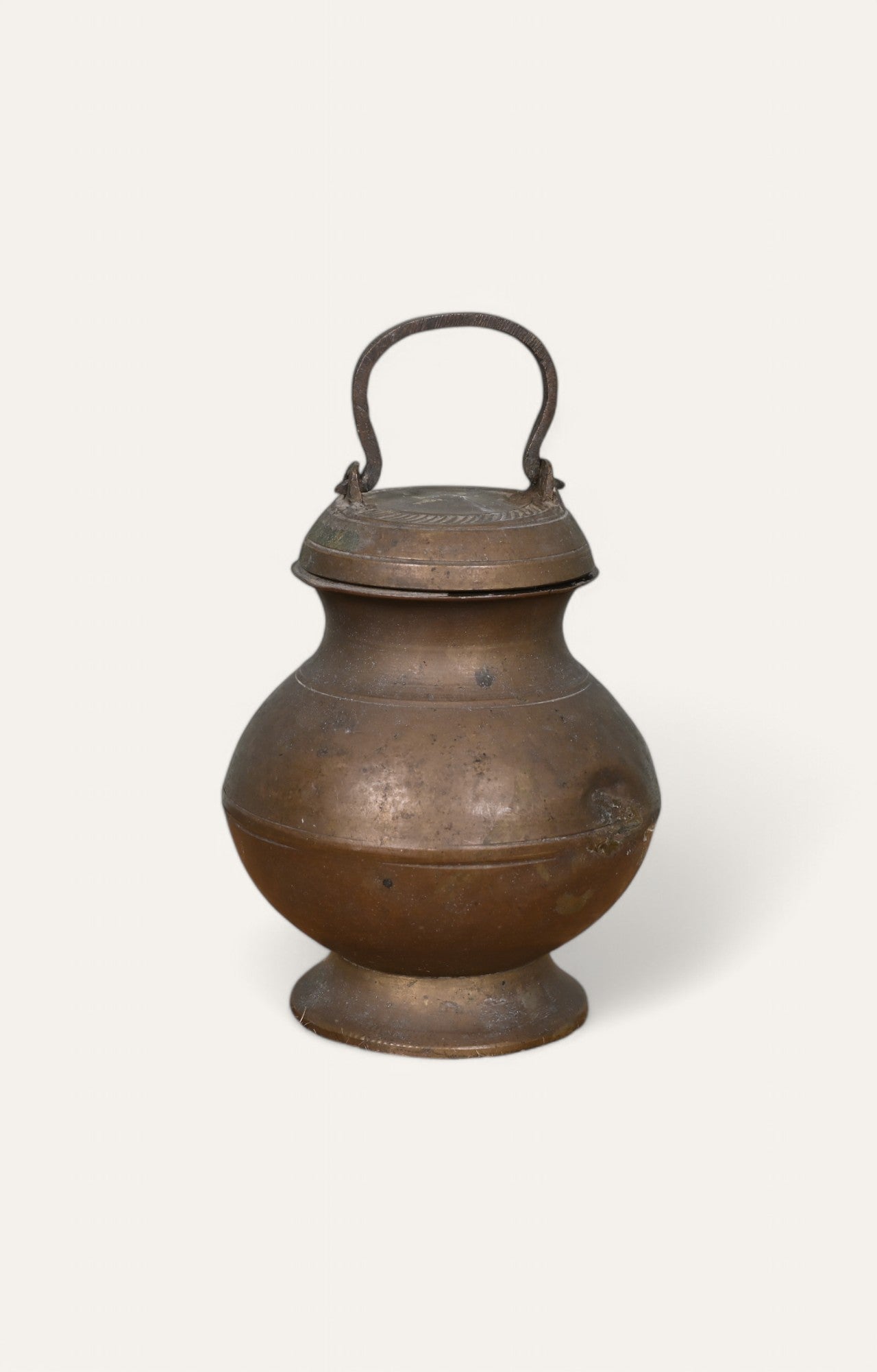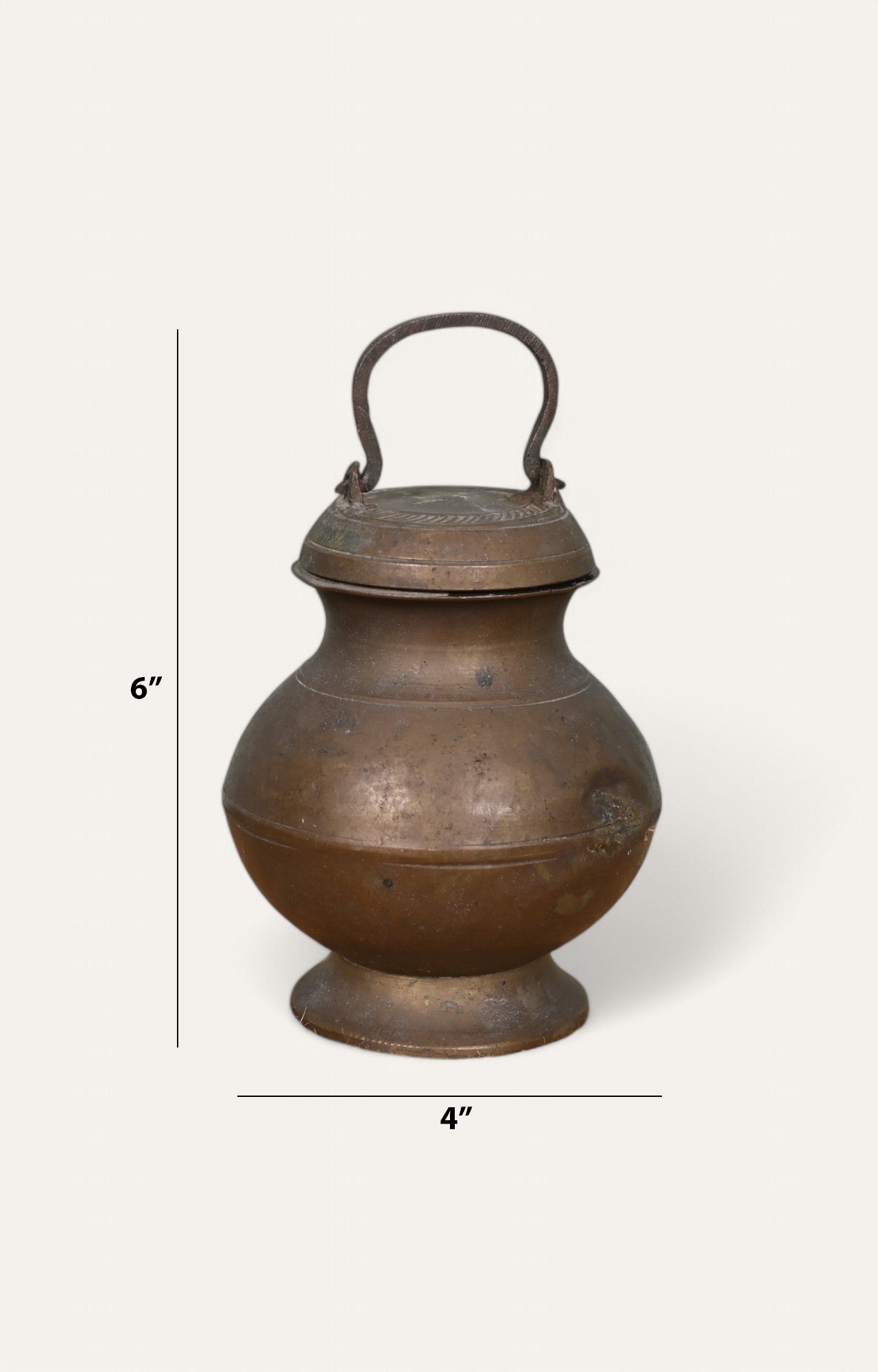 Crafted from solid brass, showcases traditional metalworking with a sturdy handle and engraved lid. A versatile décor piece for homes, cafes, or offices. Ideal as a planter, storage container, or a unique display accent blending heritage with modern interiors.
