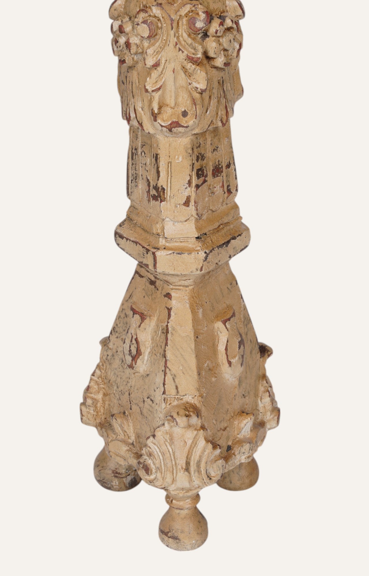 Made of solid teak wood, this tall candle stand boasts deeply carved classical flame carvings in a distressed gold finish to exude character and warmth. While it functions as a statement piece with candles or on its own, it is perfect for positioning by doors, consoles, or alcoves.