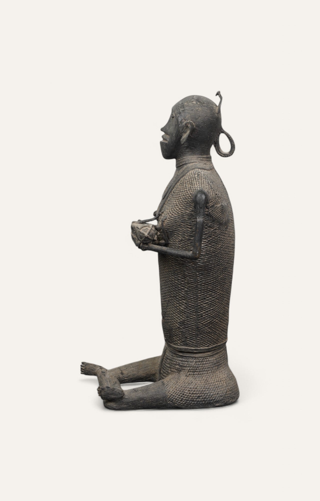 Made of solid brass, this vintage tribal sculpture is a marvel of traditional workmanship. This 60+ year old piece of art showcases a lady with her infant in a peaceful seated pose. With delicate hand-carved detailing, this decorative brass statue brings a rural, heritage-chic allure to consoles, bookshelves, or thoughtful corners.