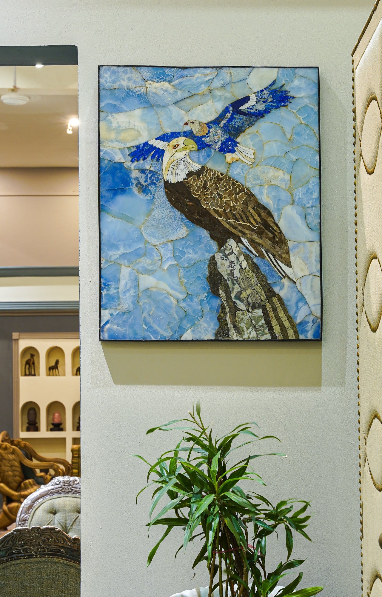 This semi-precious stone panel showcases a bald eagle and a smaller bird, set against a sky-like backdrop. The birds are meticulously crafted with varying shades of stones, highlighting the eagle's strength and the smaller bird's agility. The background features soft blue tones, creating a cloud-like effect. The tree stump on which the eagle perches adds depth with earthy tones. The panel is a striking example of stone mosaic artistry, conveying power, freedom, and balance within nature.