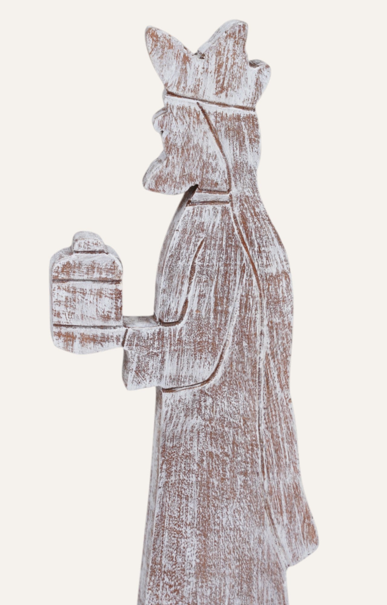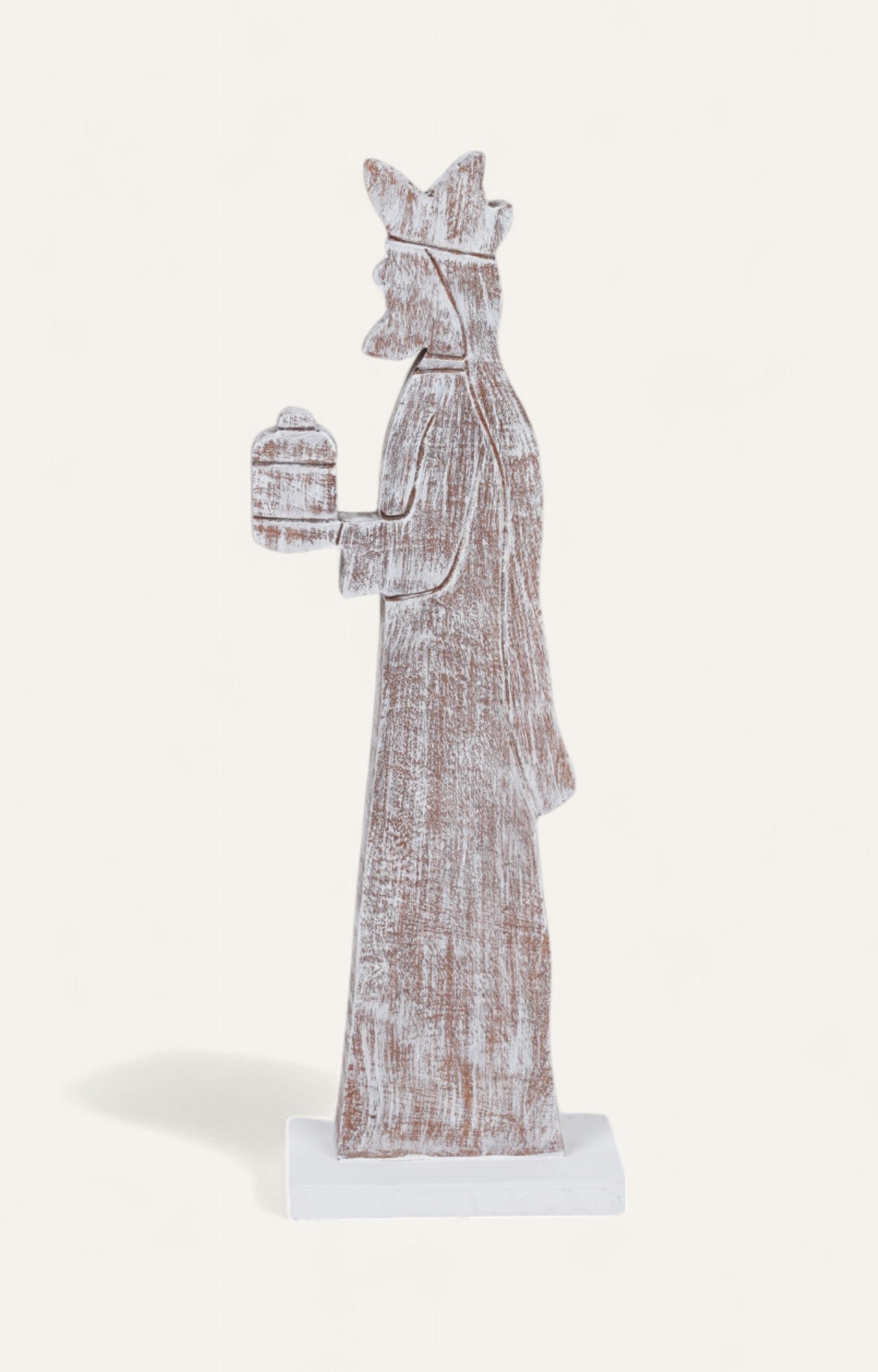 This charming wooden figurine depicts Balthazar, one of the Wise Men, bearing gifts for the Christ Child. Handcrafted with a rustic whitewash finish, it features intricate details like his flowing robes and a crown. This elegant piece will add a touch of spirituality and artistry to your Christmas décor.