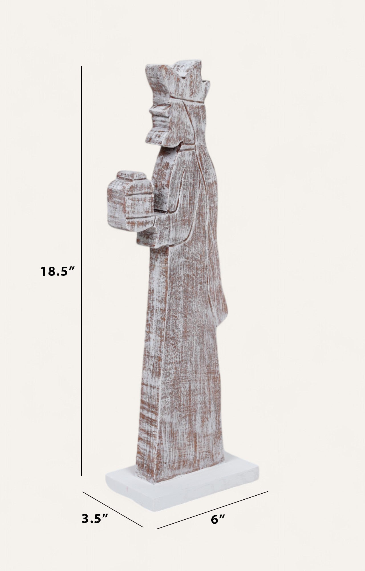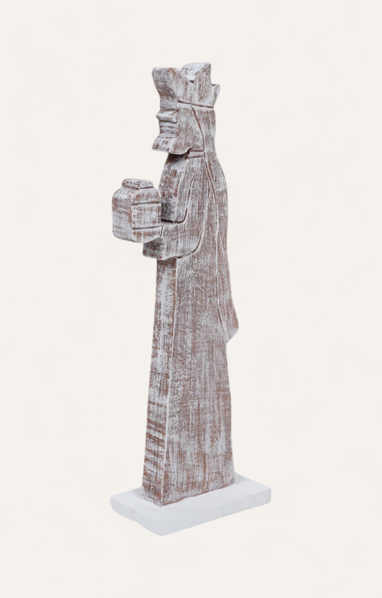 > Hand-carved wooden figurine of a wise man with a weathered, white finish.